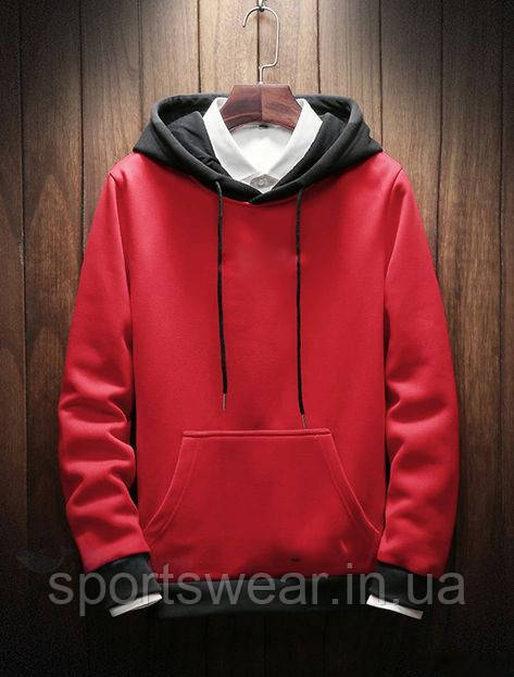 Купити чоловічу спортивну кофту з капюшоном червоного й чорного кольору в інтернет-магазині модного чоловічого одягу https://sportswear.in.ua Модна стильна червона кофта-кенгуру на літо, весну, осінь.